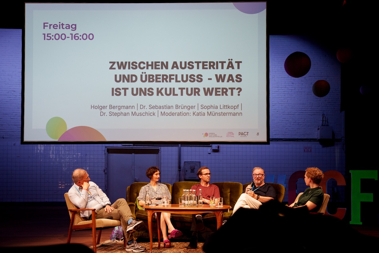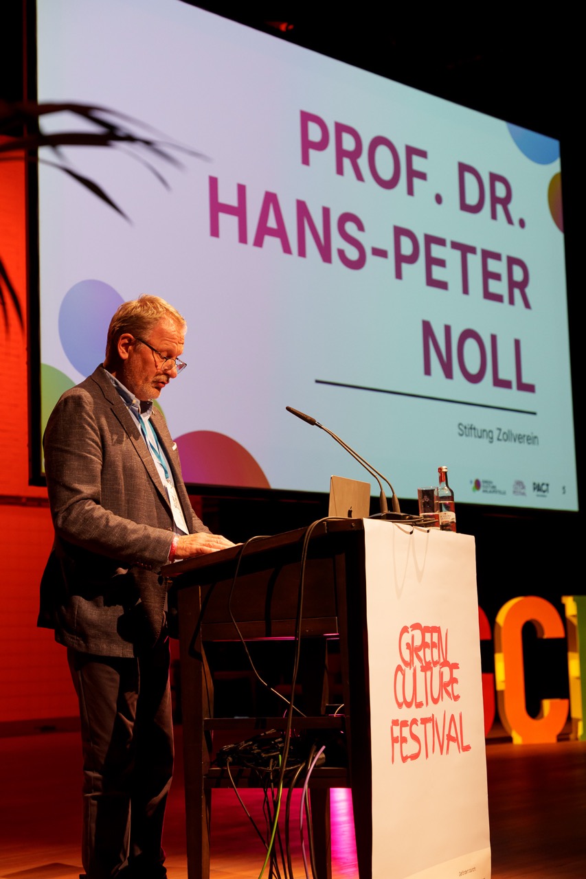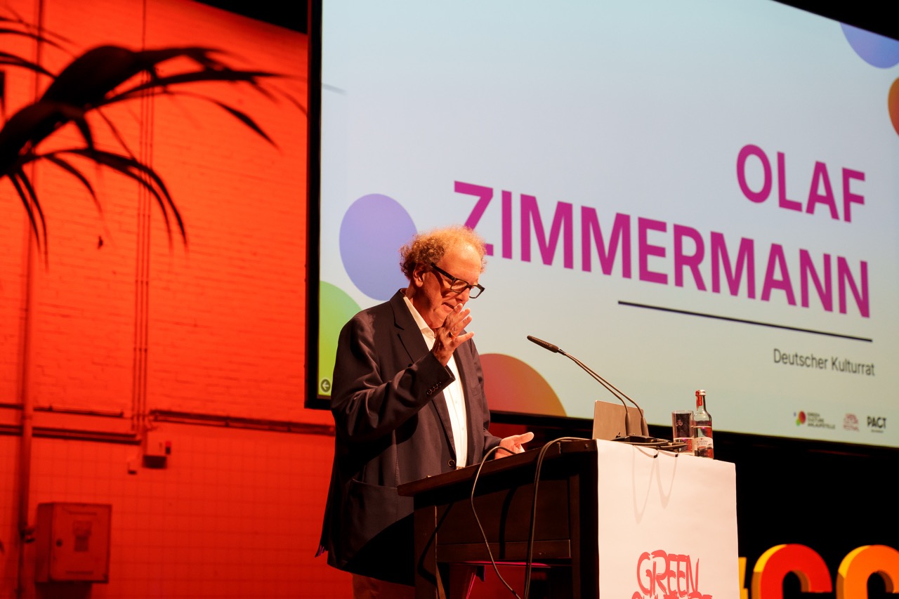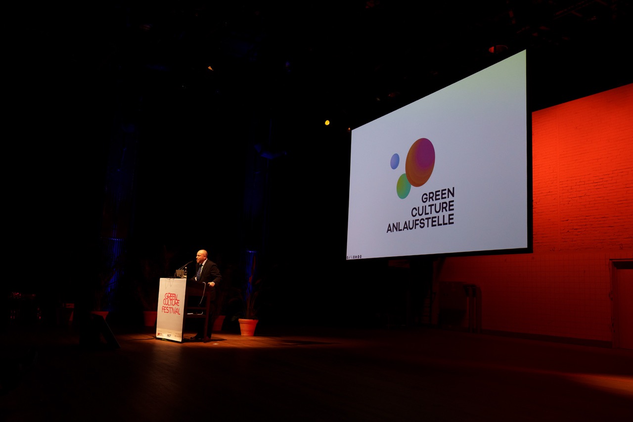 Auf der großen Bühne beim Kooperationspartner PACT Zollverein kamen starke Stimmen aus Kultur, Politik und Zivilgesellschaft zusammen – darunter Vertreter:innen des Beauftragten der Bundesregierung für Kultur und Medien, der die Green Culture Anlaufstelle und das Festival fördert, des Ministeriums für Kultur und Wissenschaft des Landes Nordrhein-Westfalen, der Stadt Essen, der Stiftung Zollverein, des Deutschen Kulturrats und der Green Culture Anlaufstelle selbst.