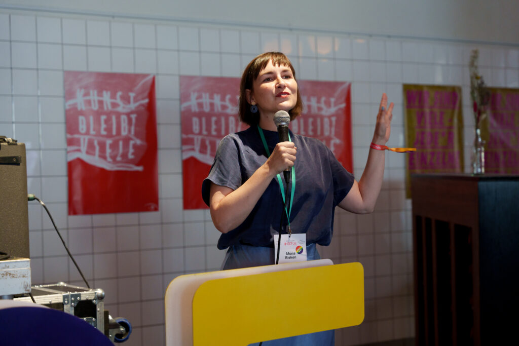 Unter anderem mit dabei: Anna Haas vom Netzwerk Nachhaltige Kultur Karlsruhe, das mit bereits 12 Institutionen und weiteren potenziellen Akteur:innen ein regionales Projekt zu Materialkreisläufen initiiert.