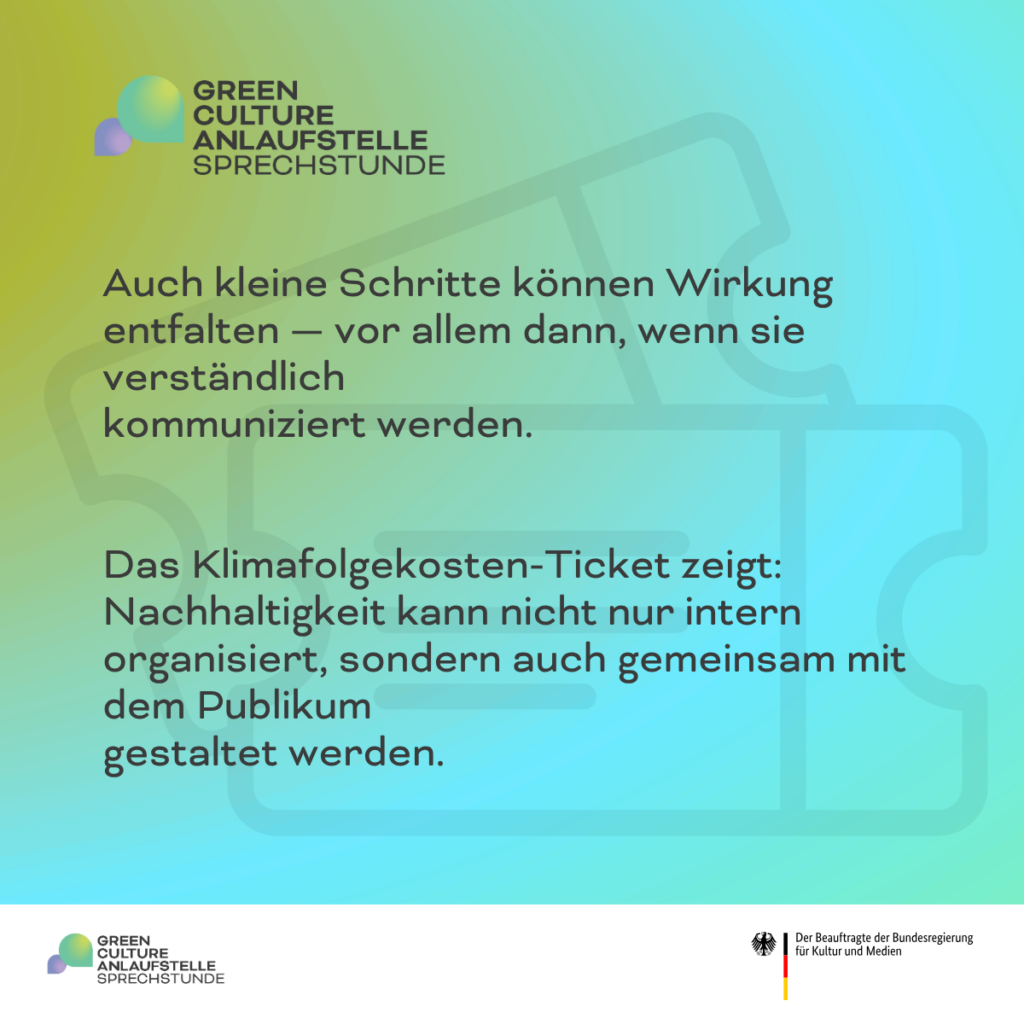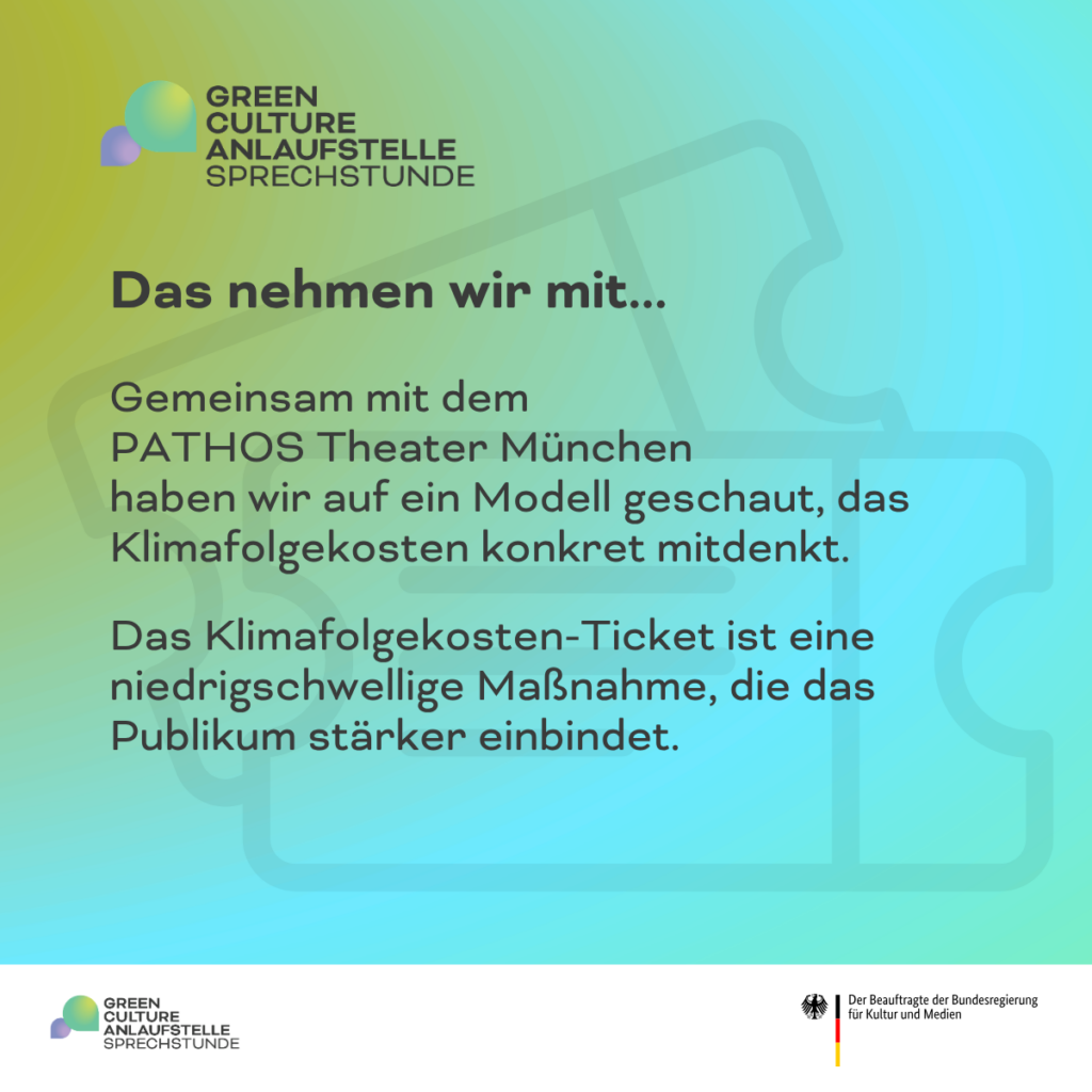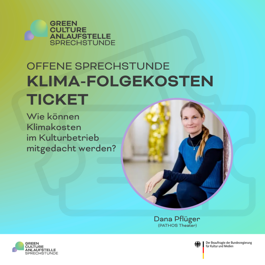 Am 25. März 2026 fand unse­re Offe­ne Sprech­stun­de zum The­ma Kli­ma­fol­ge­kos­ten­ti­cket statt. Zu Gast war Dana Pflü­ger vom Pathos Thea­ter in Mün­chen, die das Kli­ma­fol­ge­kos­ten-Ticket bereits erfolg­reich umset­zen. Mode­riert wur­de die Ver­an­stal­tung von Melin­da Wei­den­mül­ler aus dem Team der Green Cul­tu­re Anlauf­stel­le.