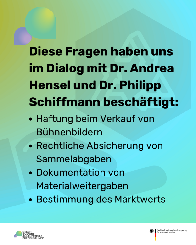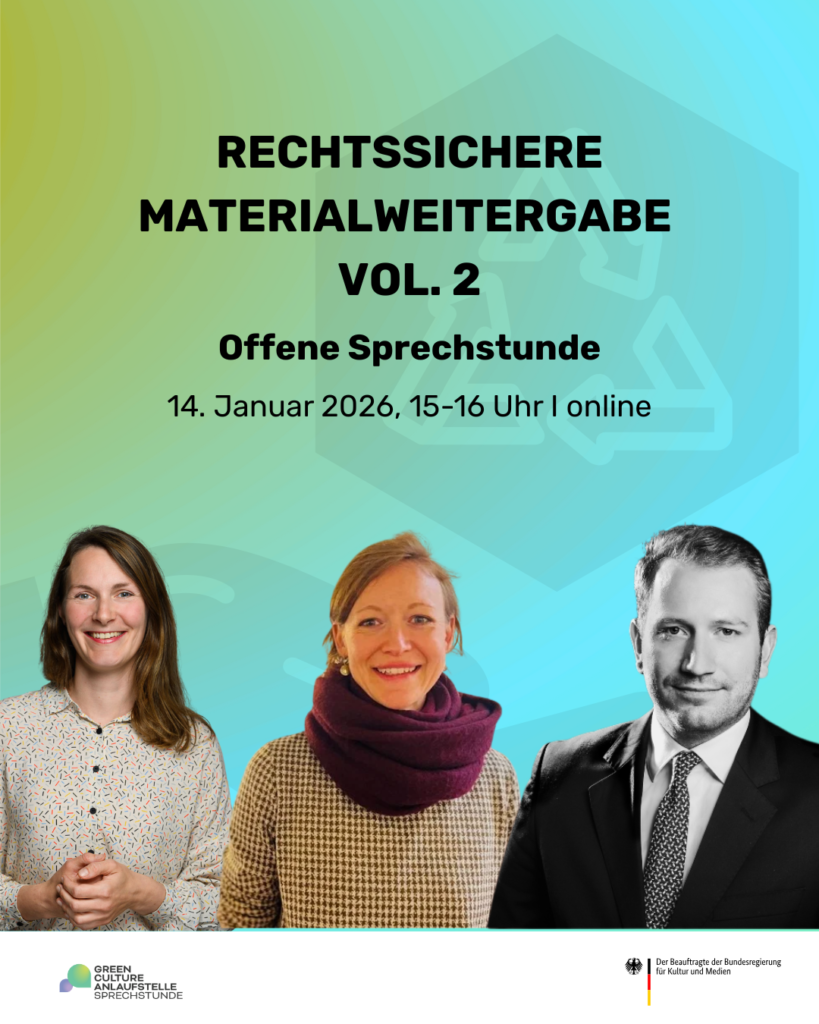 Am 14. Januar 2026 fand unsere digitale Offene Sprechstunde „rechtssichere Materialweitergabe Vol. 2“ statt. Mit 60 Teilnehmenden sind wir in einen fokussierten, praxisnahen Austausch gegangen und konnten gemeinsam mit Dr. Andrea Hensel (Referat Strategische Kulturpolitik der Stadt Leipzig) und Dr. Philipp Schiffmann (Unverzagt Rechtsanwälte) auf viele Fragen und Details eingehen. Schon im Vorfeld zeigte sich der konkrete Bedarf: „Was muss beachtet werden beim Verkauf auf internationaler Ebene?“, „Können wir den Marktwert dadurch ermitteln, dass wir etwas im Rahmen einer Auktion verkaufen?“ oder „Wie kann ich den Restwert bewerten (Buchwert vs. Marktwert) – und welchen Wert muss ich berücksichtigen?“.