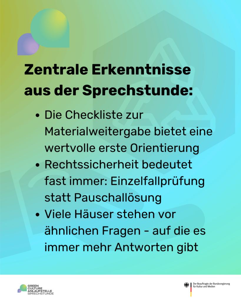 Deutlich wurde: Materialweitergabe ist längst Konsens in der Kulturszene – aber die rechtliche Einordnung hält oft nicht Schritt mit dem Tempo der Praxis. Viele Fragen drehen sich um Haftung und Zuständigkeiten, um sichere Dokumentation („Gibt es ein Muster für ein Dokument, mit dem man die Abgabe von Gegenständen dokumentieren kann?“) und um den Umgang mit Zielkonflikten, wenn Kreislaufwirtschaft auf Haushaltslogiken trifft („Haushaltsrecht in Einklang mit Kunst zu bekommen“).