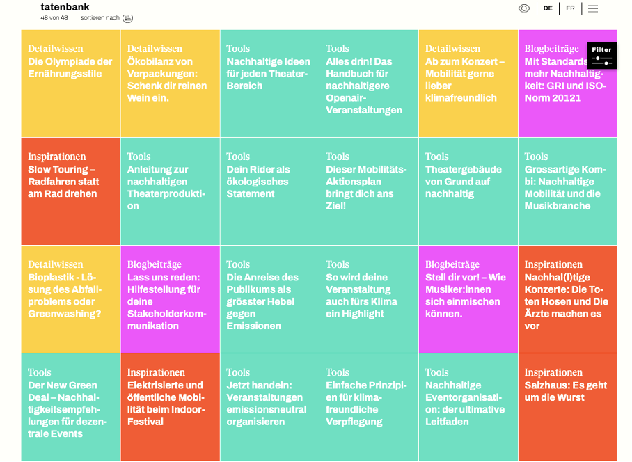 Ab sofort gibt es die TATENBANK, eine schweizweit zentrale Aktionsplattform für eine nachhaltigere Kultur von Vert le Futur – Verband nachhaltiger Kultur.