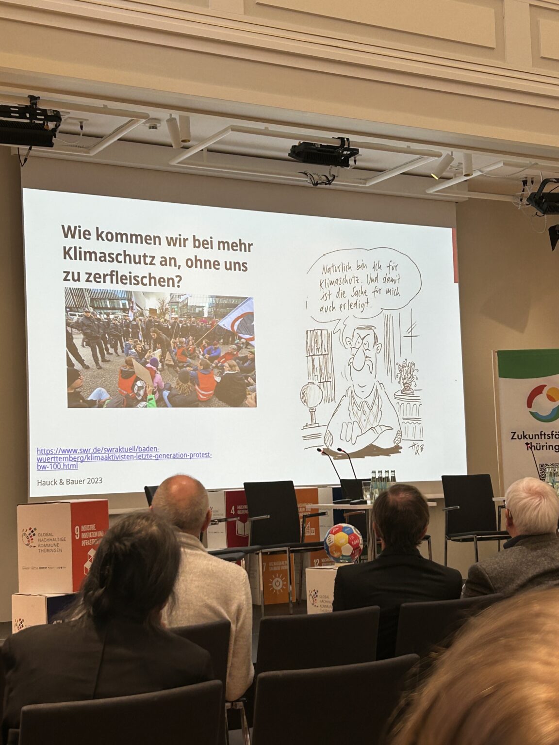 Immer wieder kam die Frage auf, wie eine gemeinsame Sprache gefunden werden kann, damit nicht jede:r etwas anderes unter Nachhaltigkeit versteht. Beate Seidel vom Thüringer Nachhaltigkeitsbeirat erinnerte daran, dass der Begriff in der Kultur im Grunde bereits angelegt, im Sinne von Werterhaltung und langfristiger Verantwortung, sei.