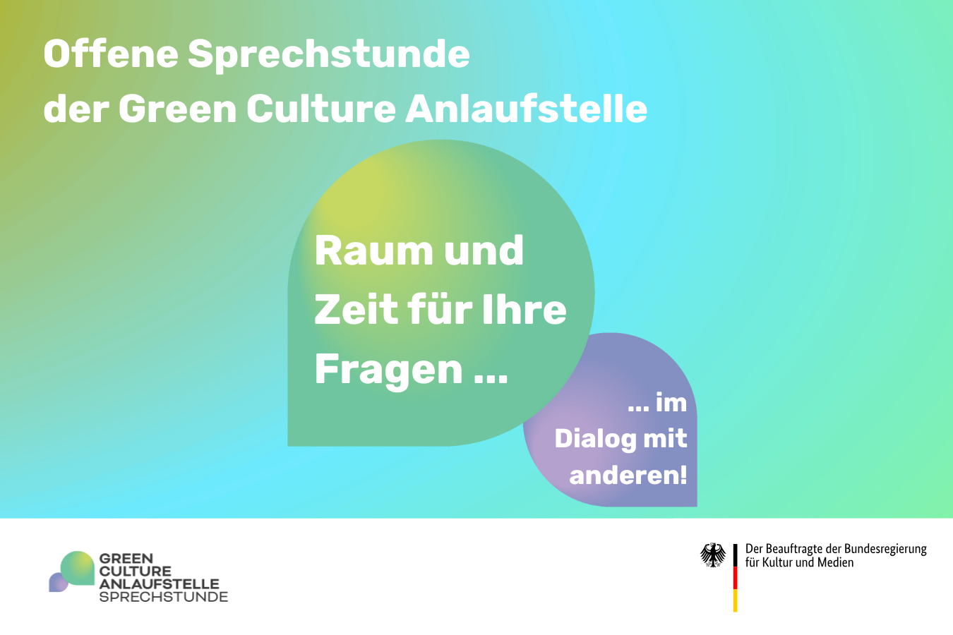 Unter dem Link unten können Sie sich zur nächsten offenen Sprechstunde anmelden. Informationen zu Termin und Inhalten der offenen Sprechstunden finden Sie in unserem Veranstaltungskalender. Für zeitnahe Hinweise auf offene Sprechstunden und andere Veranstaltungen der Green Culture Anlaufstunde abonnieren Sie auch unseren Newsletter.