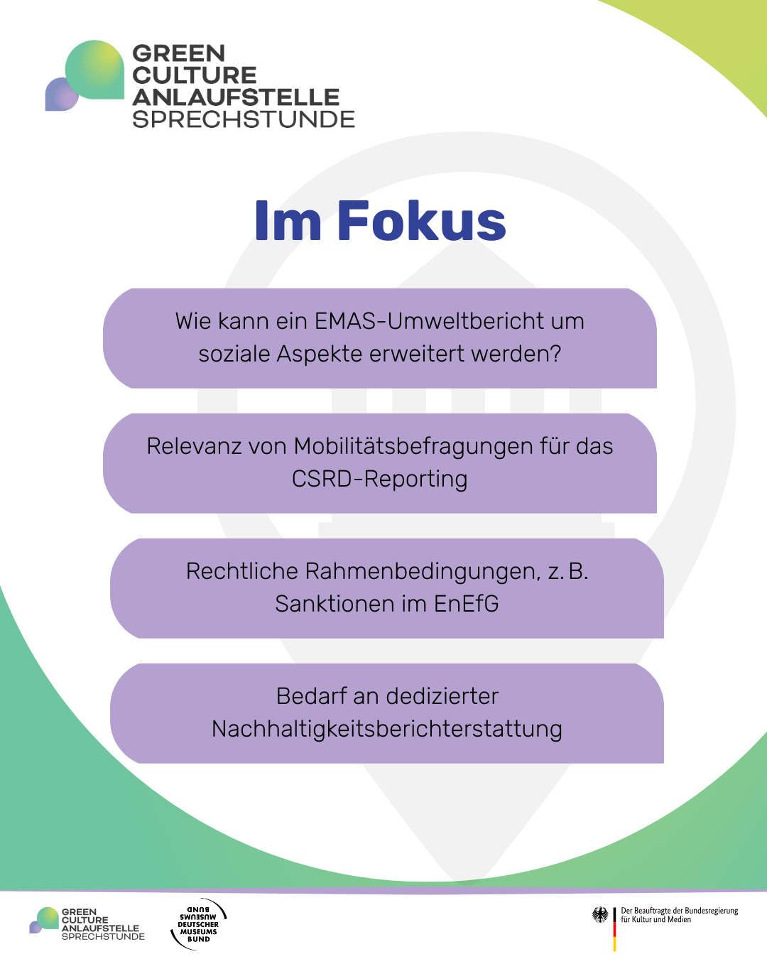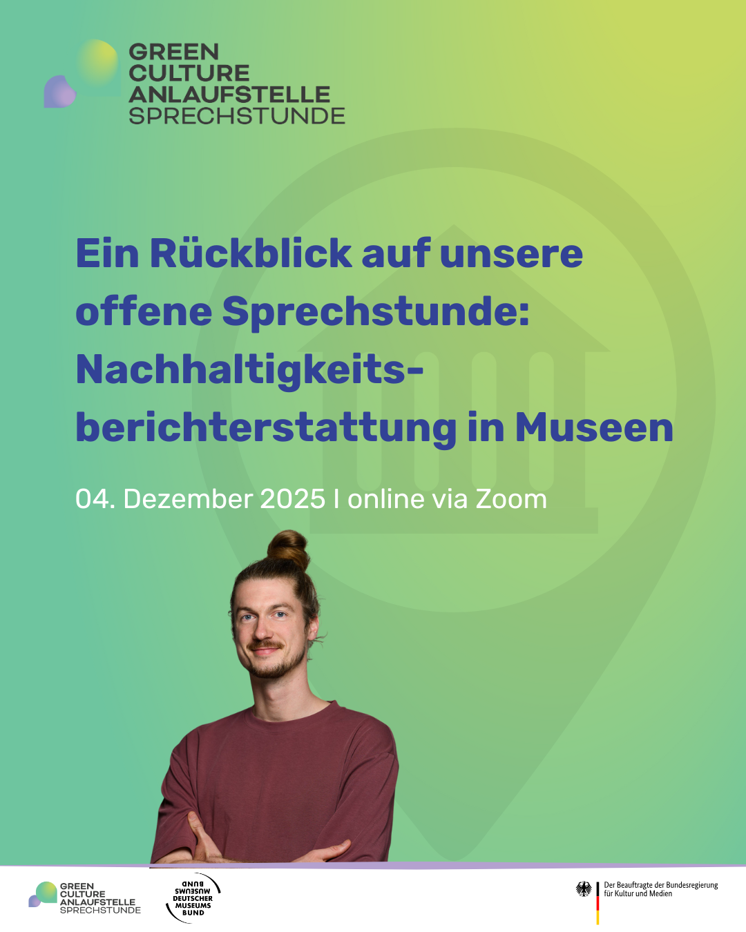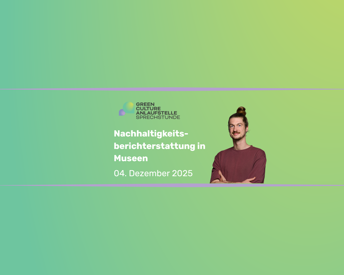 Die Veranstaltung richtet sich insbesondere an Mitarbeitende aus Museen und museumsspezifischen Institutionen, ist jedoch auch für weitere Kulturakteur*innen interessant, die sich mit Nachhaltigkeitsmanagement und ‑berichterstattung beschäftigen.