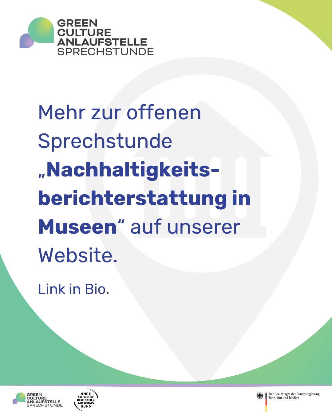 Die Fachgruppe Nachhaltigkeit des Berliner Museumsverbands lädt gemeinsam mit der Green Culture Anlaufstelle zu einer Online-Infoveranstaltung rund um das Thema Nachhaltigkeitsberichterstattung in Museen ein.