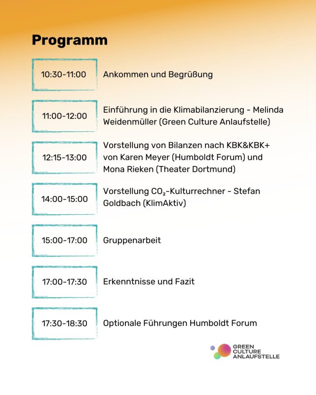 Die Green Culture Anlaufstelle lädt Sie am Donnerstag, den 20.02.2025 zum Workshop zur Klimabilanzierung mit dem Bundesrechner von 11:00 – 17:30 Uhr im Humboldt Forum in Berlin ein.
