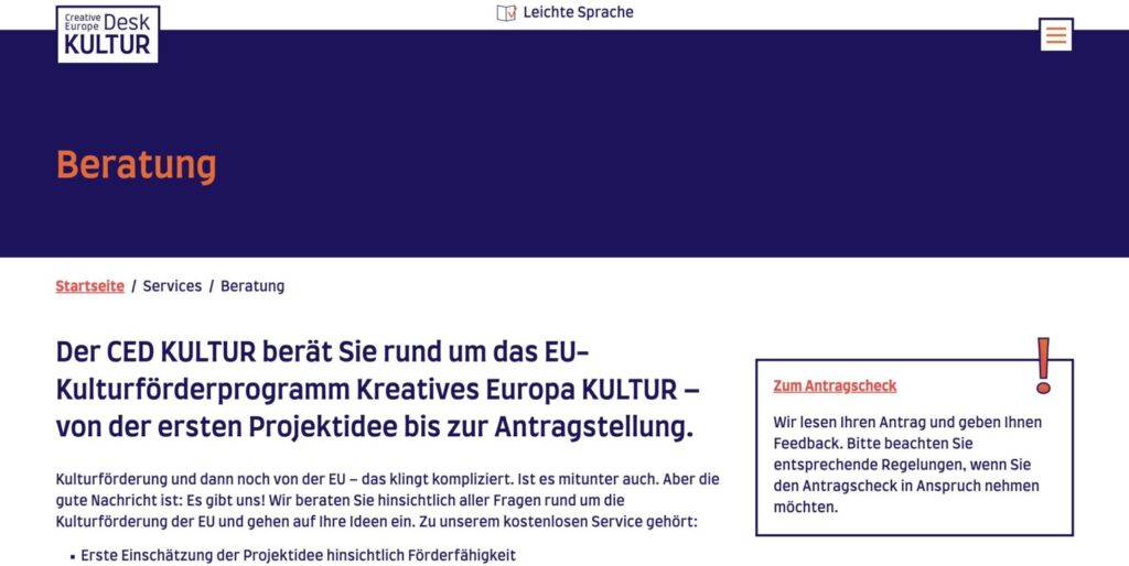 - Die Beratung richtet sich an Kulturakteur:innen, die sich für das EU-Kulturförderprogramm Kreatives Europa KULTUR bewerben möchten.