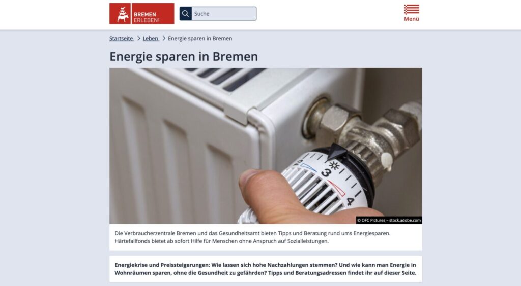 - Der Artikel auf der Webseite der Stadt Bremen bietet Tipps von der Verbraucherzentrale Bremen und dem Gesundheitsamt zum Energiesparen