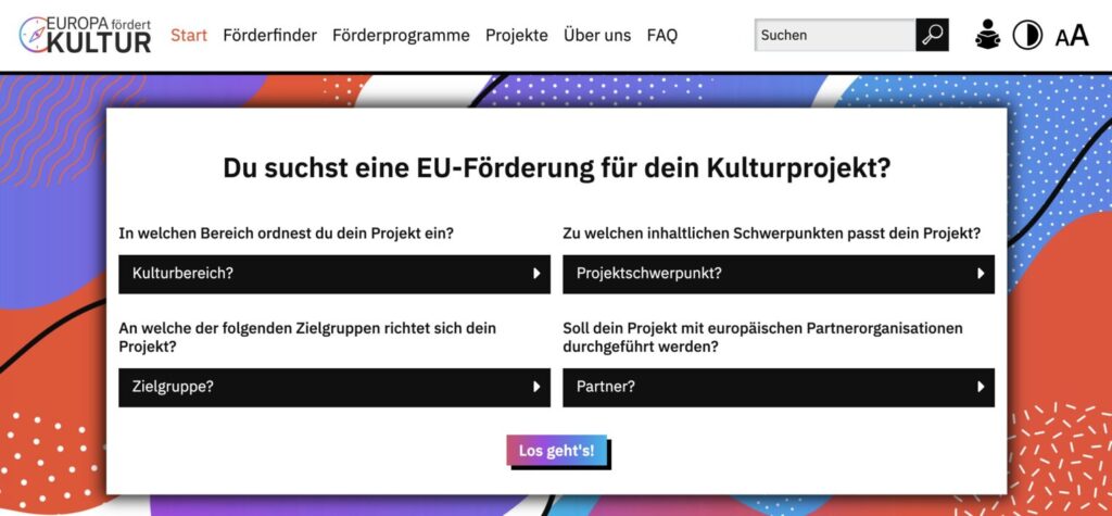• Bereit­ge­stellt von den Crea­ti­ve Euro­pe Desks KULTUR (Deutsch­land & Öster­reich) bie­tet die Platt­form eine kura­tier­te, aktu­el­le Ori­en­tie­rung im EU-För­der­dschun­gel.
