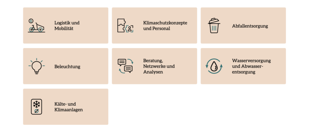 - Projekte können gezielt die passende Förderung finden, indem sie die Filter nach Themenfeldern (z. B. Mobilität, Beleuchtung, Kälte- und Klimaanlagen, Abfall, Wasserversorgung, Beratung & Netzwerke, Klimaschutzkonzepte) anpassen.