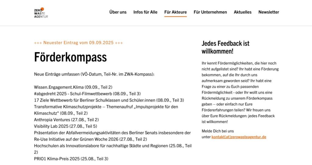 - Übersicht über aktuelle Fördermöglichkeiten für Zero Waste-Projekte und Abfallvermeidung.
