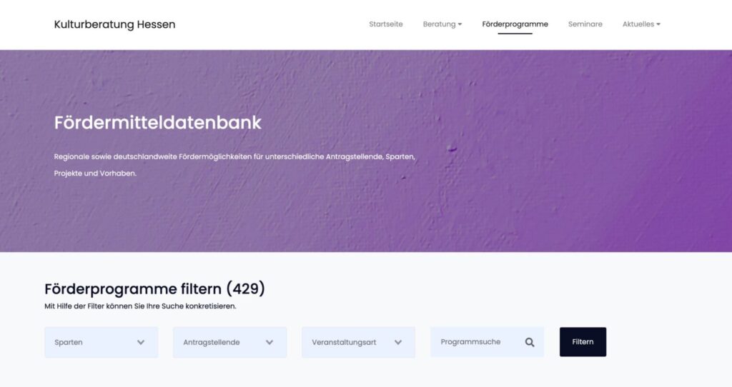 - Die Plattform bietet eine Übersicht zu Förderprogrammen auf Landes- und Bundesebene, die für Kulturschaffende in Hessen relevant sind.