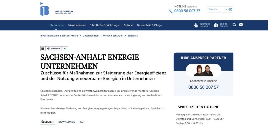 • Die Web­sei­te bie­tet einen umfas­sen­den Über­blick zu För­der­mög­lich­kei­ten und Bera­tungs­an­ge­bo­ten für Unter­neh­men und Kom­mu­nen in Sach­sen-Anhalt im Bereich Ener­gie­ef­fi­zi­enz und Kli­ma­schutz