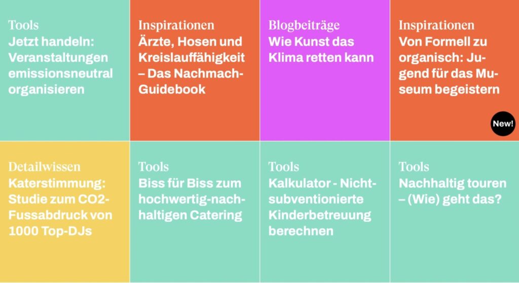 - Nutzer:innen erhalten leicht zugängliche Ressourcen, um ihre Kulturpraxis nachhaltig auszurichten und dabei kreativ zu bleiben